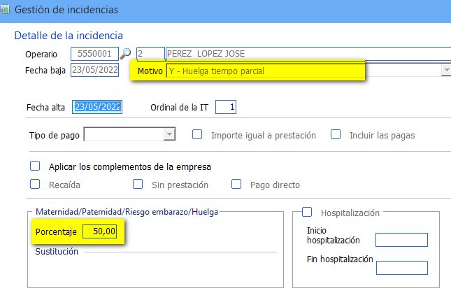 Para indicar una situación de huelga parcial, deberemos añadir una incidencia al trabajador desde Mantenimento - Personal - Incidencias, indicando la clave Y - Huelga a tiempo parcial y el porcentaje de jornada en Huelga (el NO trabajado)