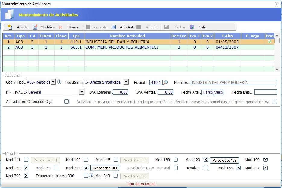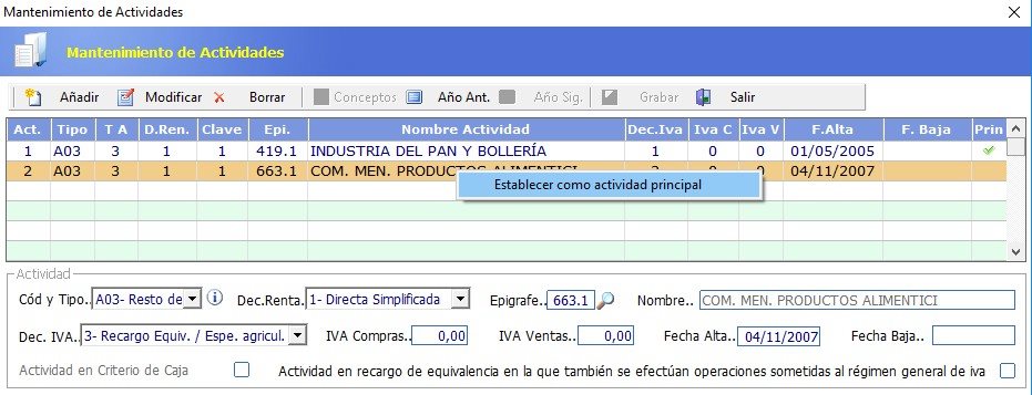 El botón [Actividades], situado en la parte superior izquierda del menú, permite dar de alta las distintas actividades desarrolladas bajo un mismo NIF.