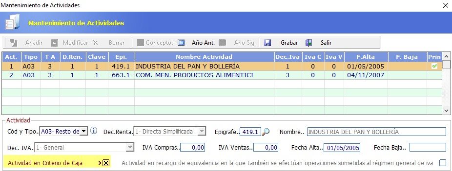 Desde la ficha de la actividad [Actividades] podemos indicar que una actividad está agocida al Régimen Especial de Criterio de Caja marcando la opción "Actividad en Criterio de Caja".